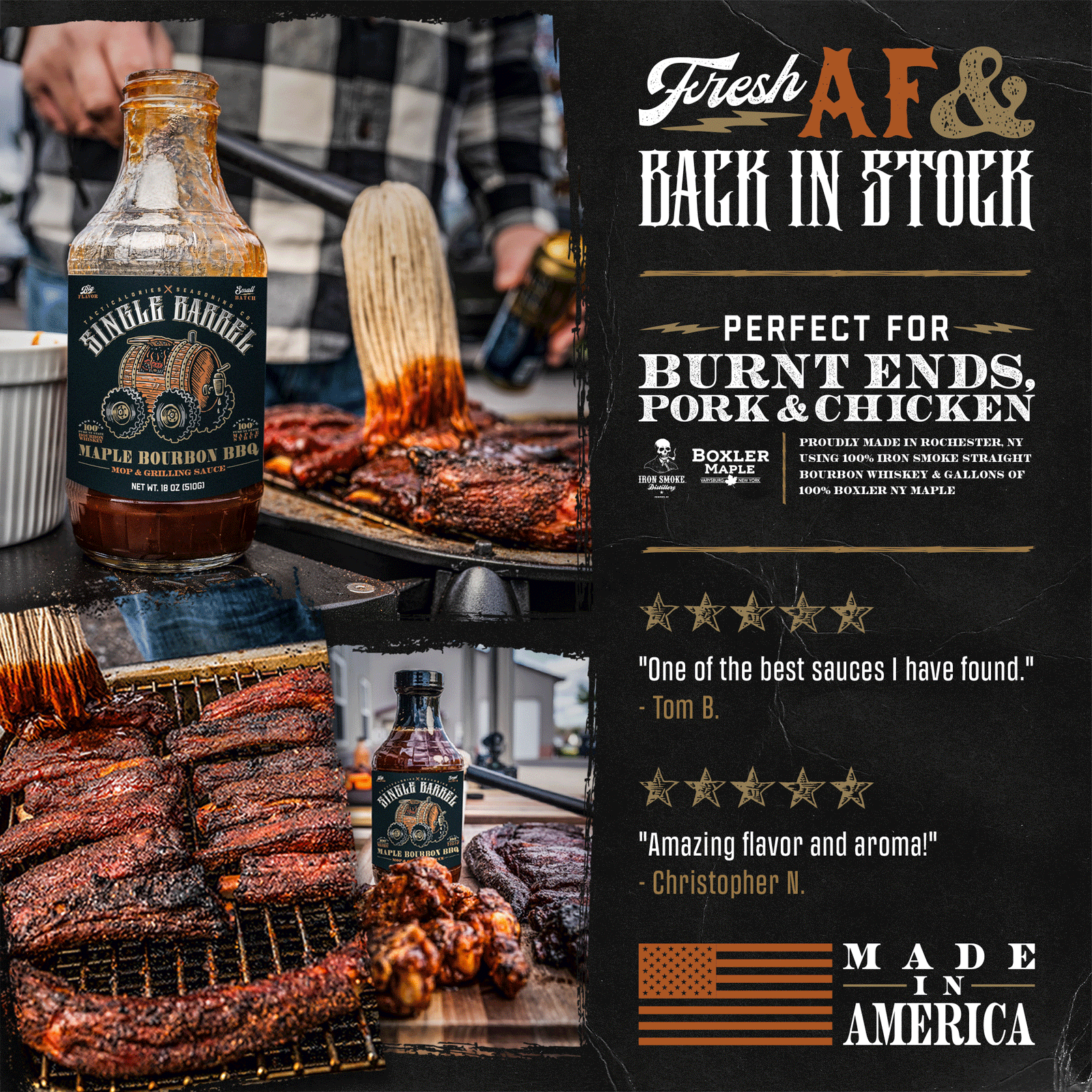 Single Barrel Mop Sauce brings rich maple & bourbon flavor inspired by rebellious American bootleggers.