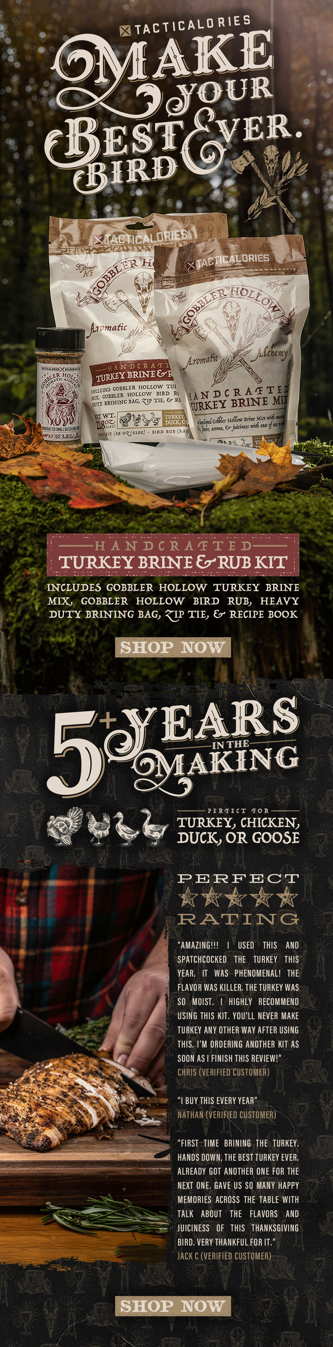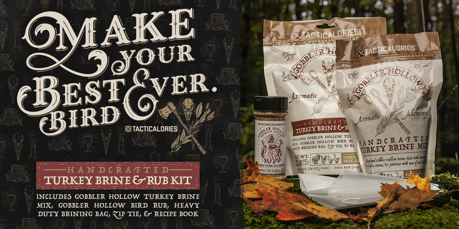 Mix entire brine mix bag into 1 gallon of ice water and 1 gallon of cold apple cider. Mix well (3-5 minutes). Place brine bag inside of clean 5 gallon bucket for stability. Place fully thawed bird in bag, breasts side down. Slowly pour brine/liquid mix over bird to fully cover. Allow the bird to soak for at least 12 hours in brine, but no less than 1 hour per lb. Prior to cooking, wash off brine, pat dry. Rub with Tacticalories seasoning and smoke, bake, fry or grill. The meat will be so moist and juicy, you’ll be gobblin' up a storm!