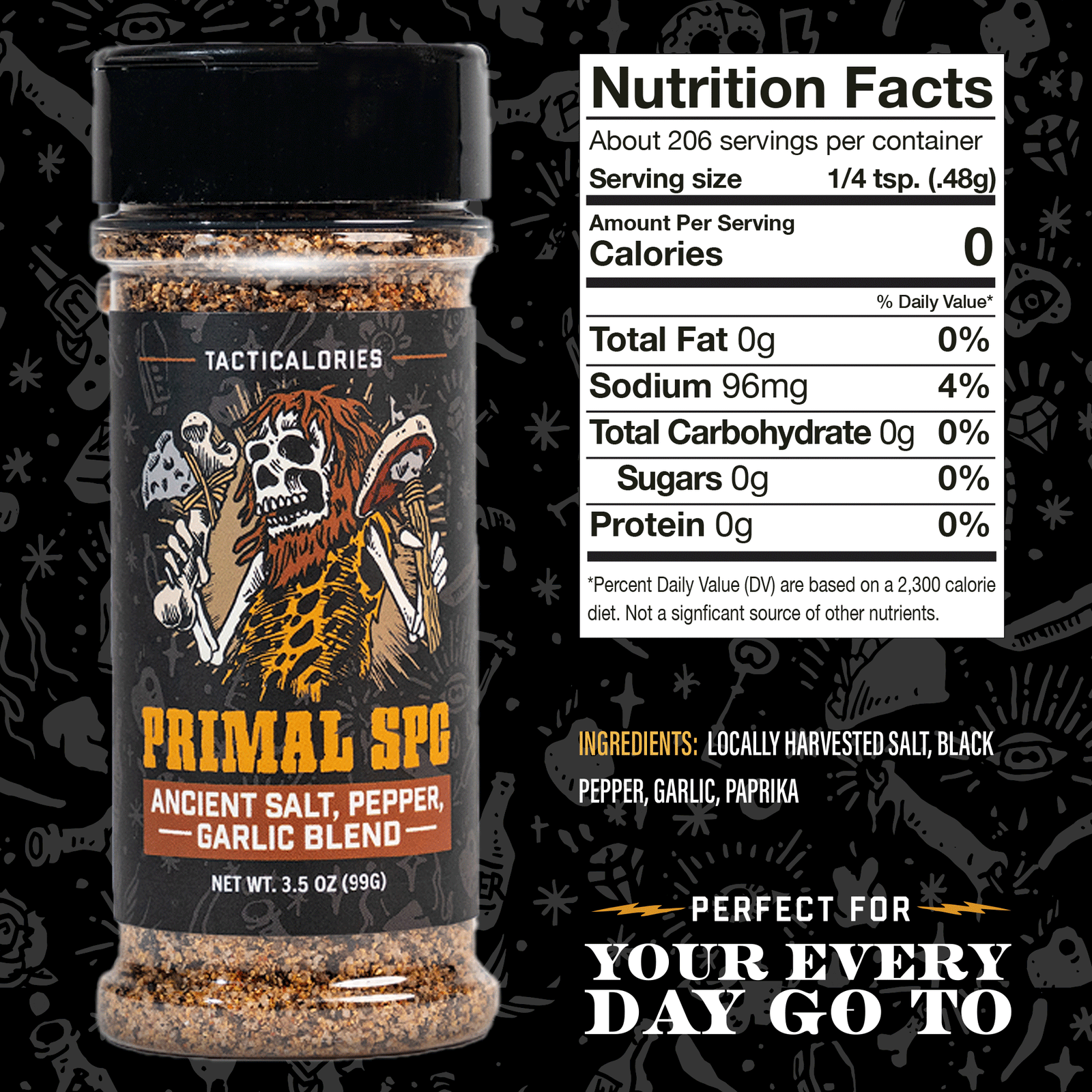 PRIMAL SPG brings the flavor with our FRESH TO DEATH salt, cracked black pepper, roasted garlic, and smoked paprika — four ingredients, zero bullshit. Built to wake up steak, chicken, and veggies without ever getting in the way. This is the blend you reach for when flavor matters and shortcuts don’t fly.
